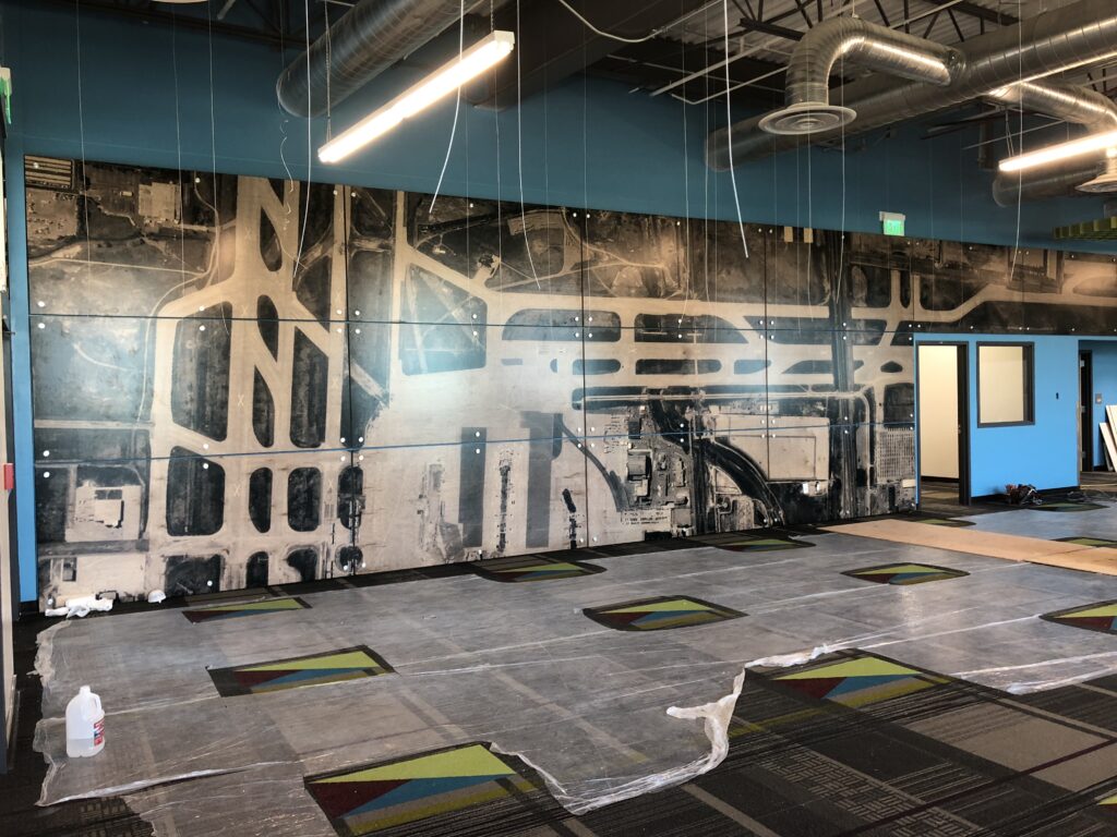 This is a panel wall I helped my friend Jonathan Korban @ JK Interior Finishes install at a Denver high school. The 4×8 panels are printed with images of the old Stapleton airport in Denver. Panels are installed on 1” stand offs. All panels had to be field dimensioned with Jonathan’s Festool track saw. Casework by JK Concepts.