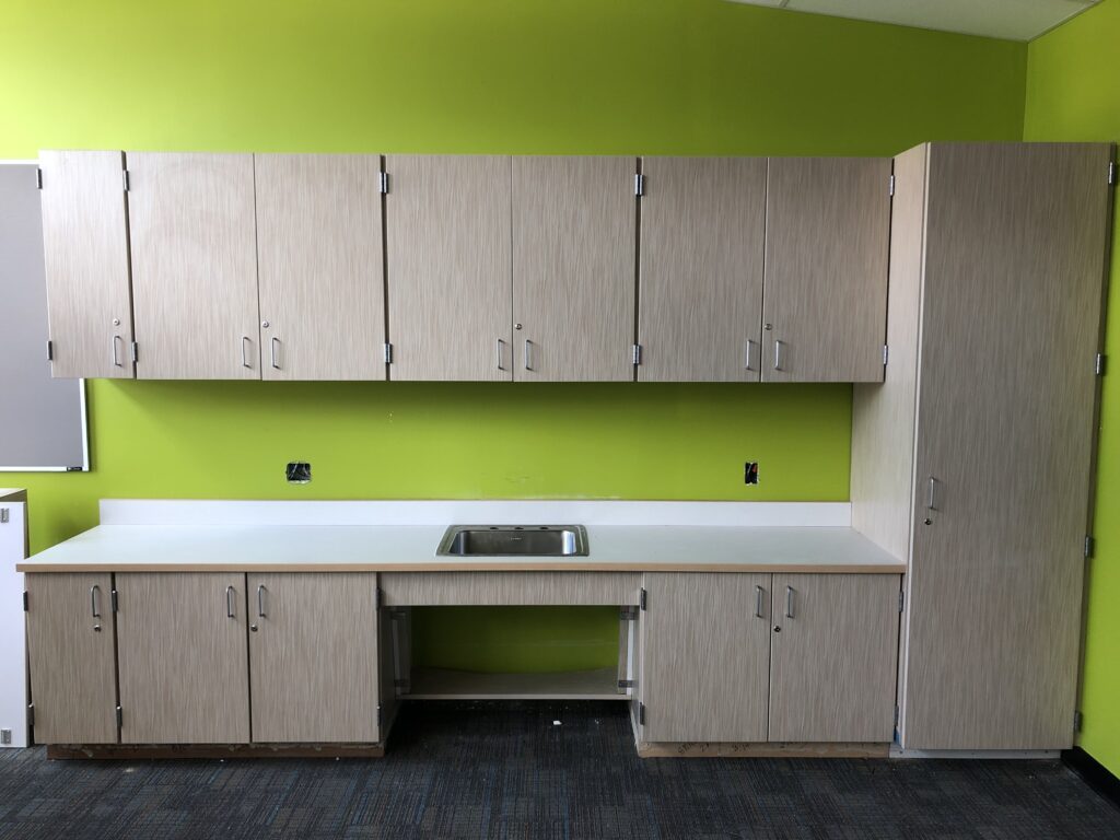 I installed 7 classrooms in a row like this one. I also installed other cabinet elevations, solid surface window sills, and other commercial and architectural casework/millworker.