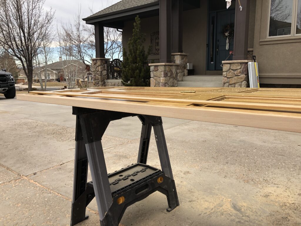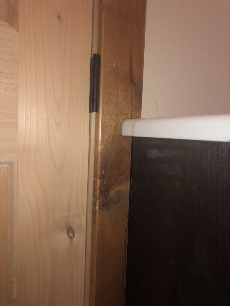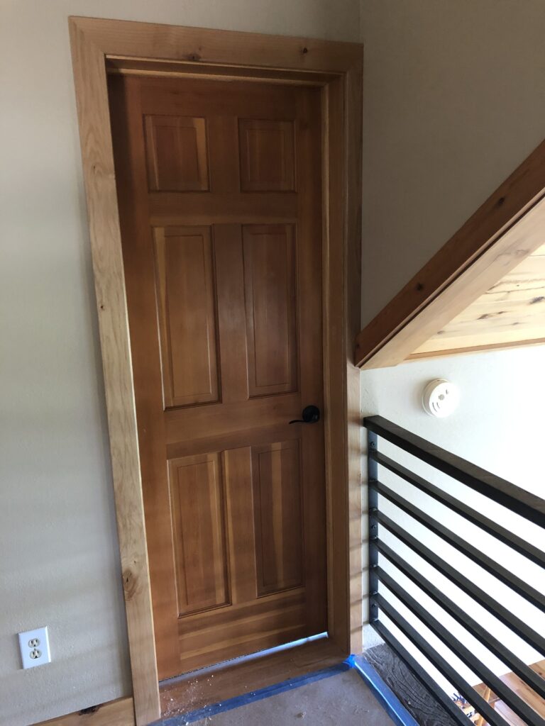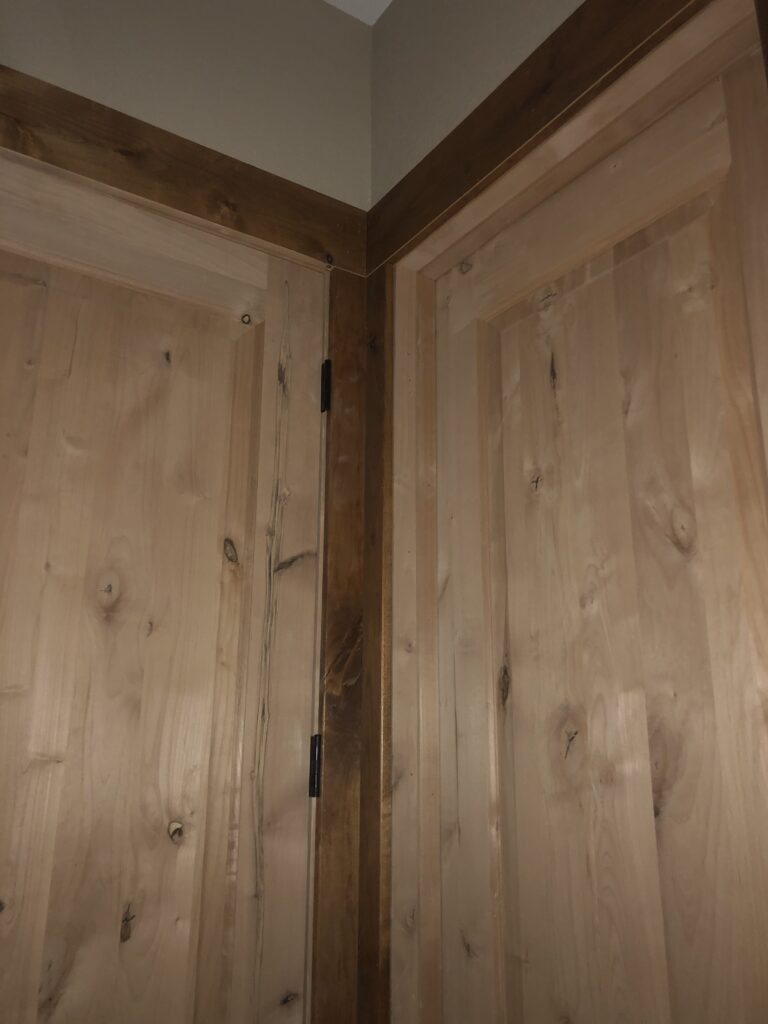 Solid core knotty alder door with schoolhouse casing detail, installed on T&G wall. One of the first jobs I bid, built and installed myself. This was winter 2105. See the sketch I submitted to builder below… first sketch also! Gluing up a blank for a large window sill. Inset basement window, case/sill. Casing had to scribe all the way around! Clean, tight miter with biscuits. Love the back-band. Had to install it with a 3/16” lap, per spec. Always line up the headers when your installing doors so the casings are level! Cutting down bifold doors to fit into opening that was framed 1/2” to narrow. I use a Kreg sled and track with my 6 1/2” Makita circular saw to achieve a flawless, straight cut. Then I clean up the edges with a sanding block to match the existing edge.