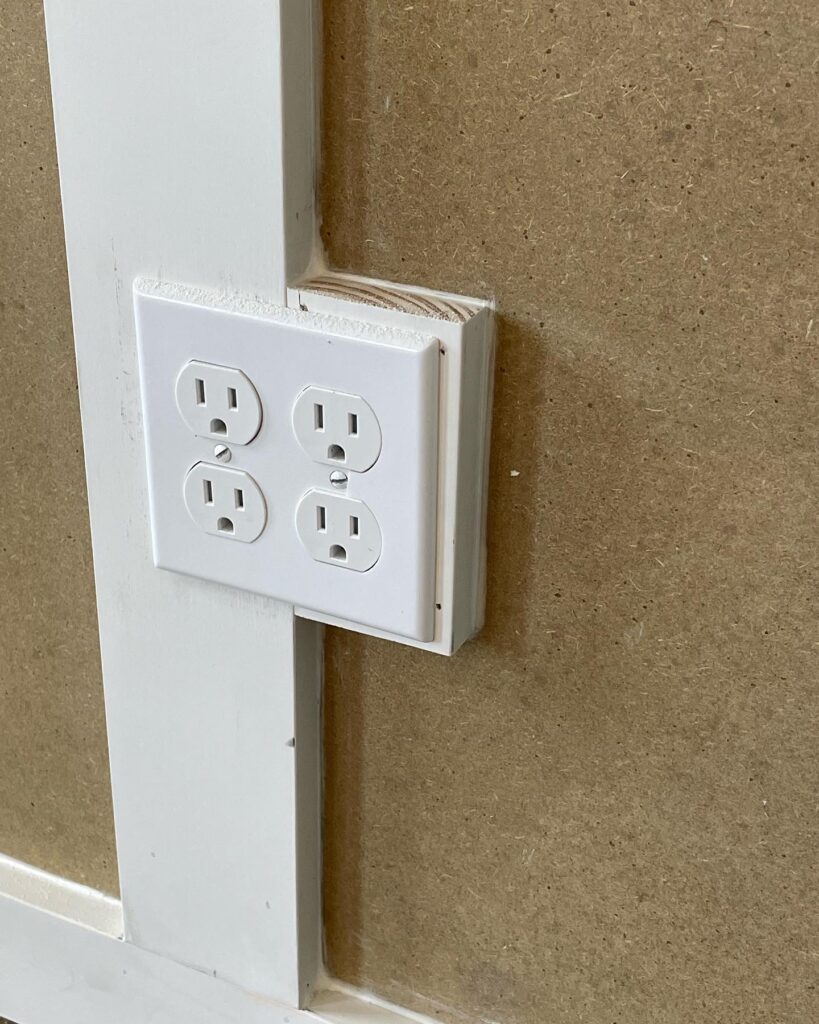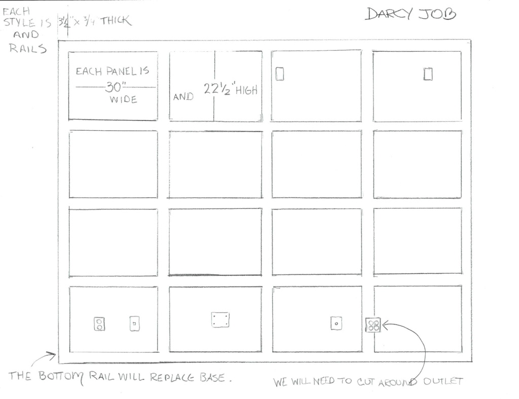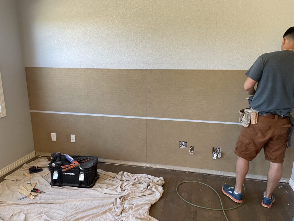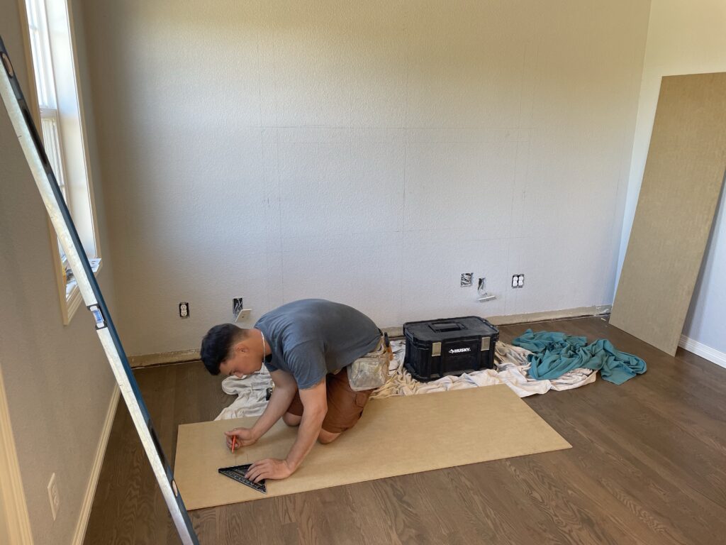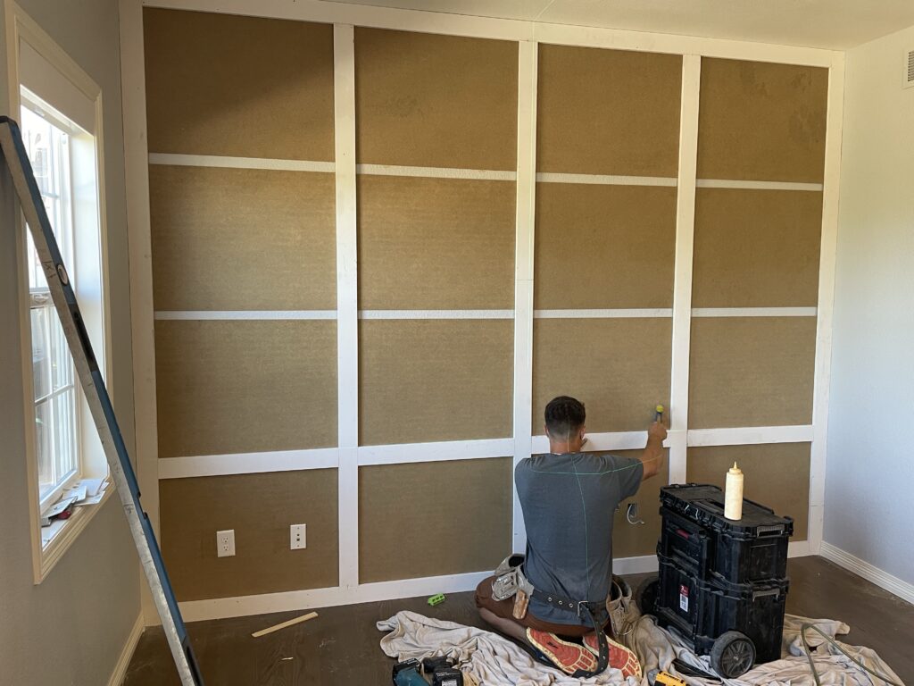 All of the dimensions are clearly labeled for the customer to see and approve. We show where all of the outlets and other utilities are in relation to the design components. Drawing by Jane Kincaid – Thru the Paintbrush Designs. In this picture lead carpenter Tristin Kincaid is marking where the outlets will come through the 1/4” MDF panel that will be the substrate behind the grid on the feature wall. The seams where the MDF panels meet will be covered by the boards that make up the grid pattern. This material comes in 4’ x 8’ pieces and so they have to be cut and placed intentionally or else there will be visible gaps when the project is completed. Once the 1/4” MDF is up the next step is to install the boards that make up the grid pattern. In this case we used pre-primed finger jointed pine 1×4 boards from the big box store. In this situation we needed to place one of the outlets into the vertical raised components of the feature wall to ensure the overall design was proportionate and pleasing to the eye. Figuring this out in the design phase allowed us to come up with a plan ahead of time and execute it properly and efficiently on the job site.All done! In this case the customers decided to paint the wall themselves, so our job here is done!