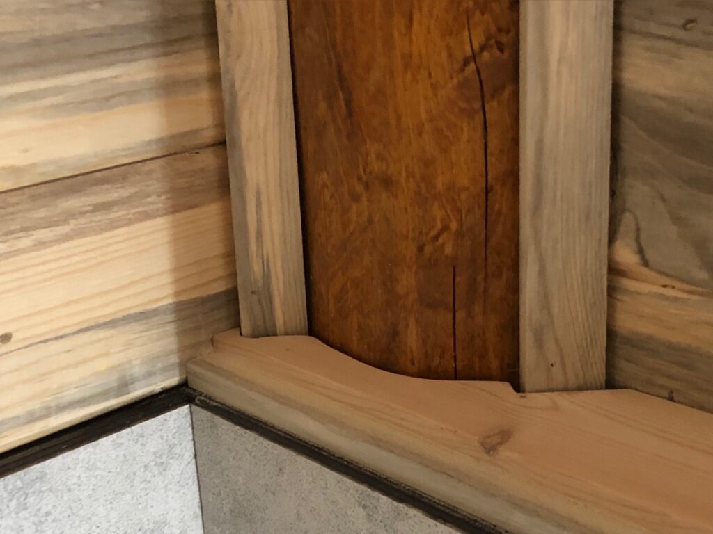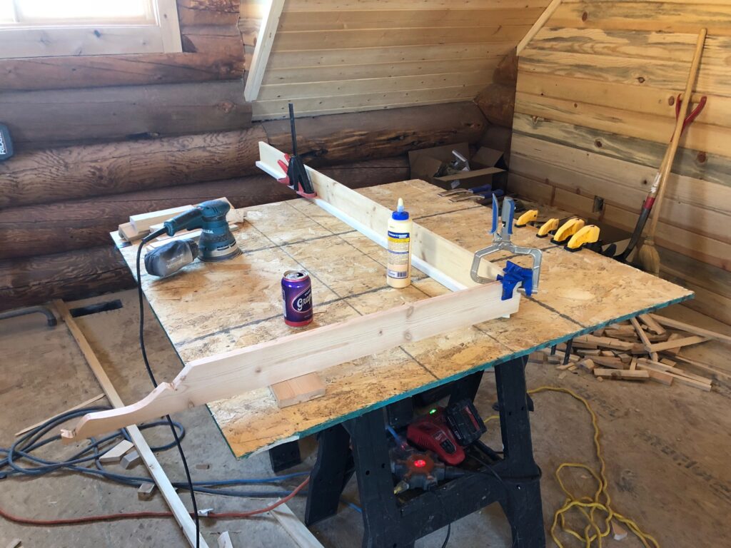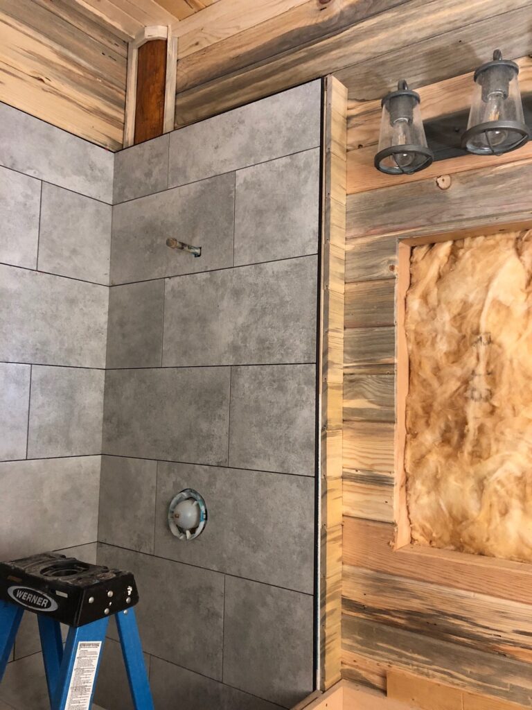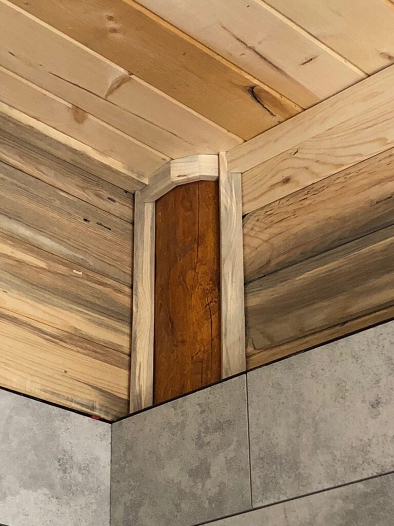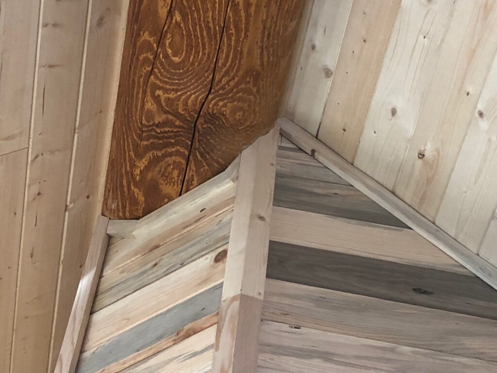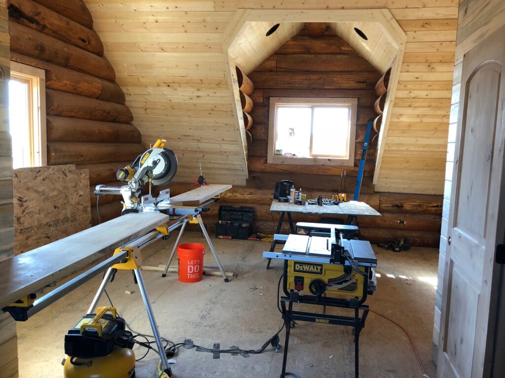 Working in a log home definitely ups your scribe game! In this instance a interior wall finished with barn wood, butted into a log exterior wall leaving a large void in the corner between them. As all the walls in this custom home are either exterior log walls or interior walls finished with tounge and groove pine or barn wood, every where a wall meets a ceiling or another wall, trim needs to be applied in order to cover the gaps. In most areas a trim piece was fabricated using 1×2 pine; single, vertical pieces were used to cover inside corners and multiple pieces were used to construct custom trim pieces for outside corners, soffits, etc. in this situation, the void, or gap, was too large for a piece of 1×2 to cover, so the solution was to use a piece of the barnwood and scribe it to the exterior log wall. To do this, i started with a template piece of scrap plywood and tacked it onto the wall using a couple bead nails. I then used a large compass, or scribing tool, to transfer the profile of the logs to the plywood. I cut the profile out with a jig saw, then repeated the process until I was happy with the fit. Next, I set the template on top of a piece of barn wood already cut to size, and traced the lines. Finally, I cut those lines with a jig saw, cleaned them up with sand paper and a sanding block, and installed it.
