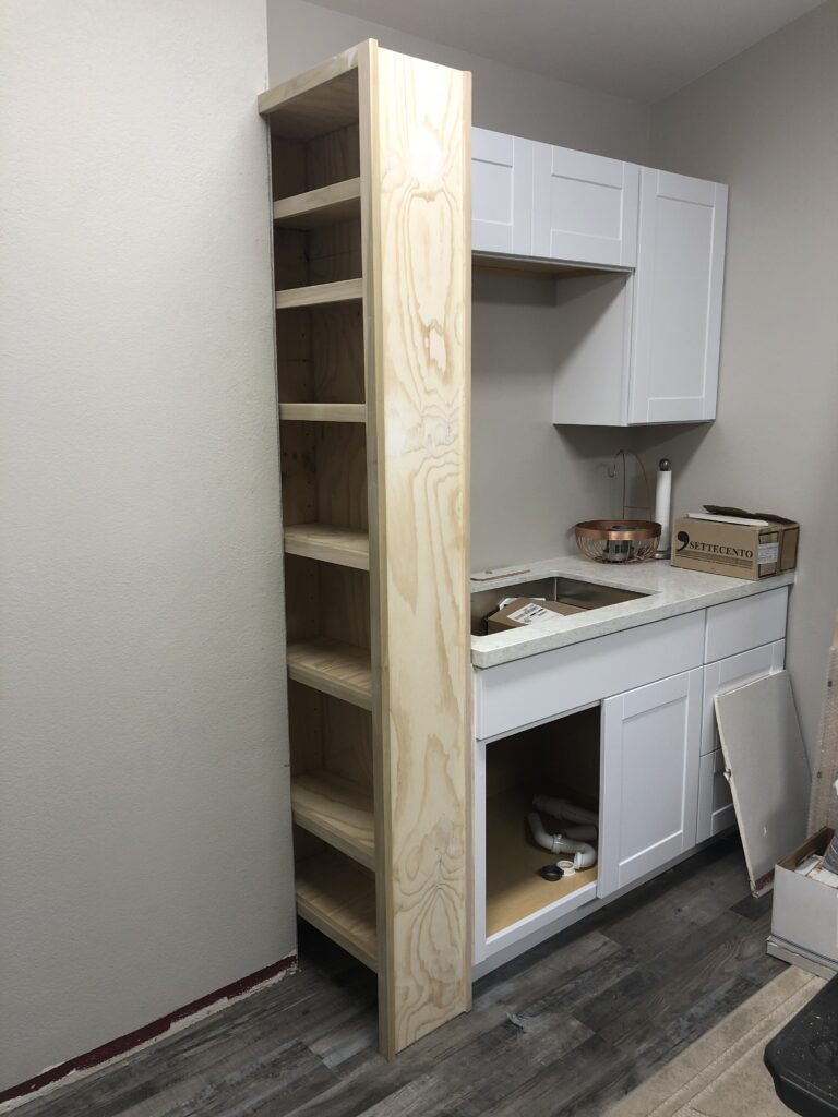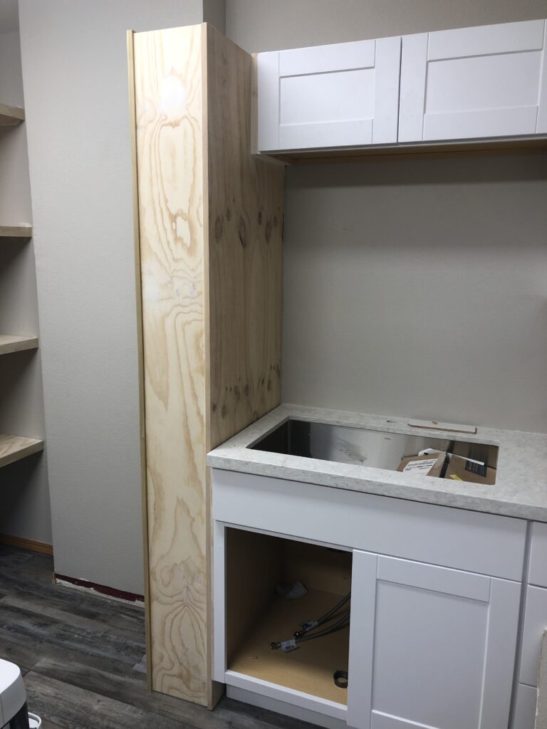 These were the two design options we offered the customer for the custom cabinet we built and installed in Loveland, Colorado. After install picture below. This is the finished product. We designed this cabinet to maximize the use of space in an awkward area between existing cabinets and the wall. This cabinet had to fit perfectly between the existing cabinets and the wall. We built custom fillers where our cabinet meets the existing cabinets to ensure a seamless fit.