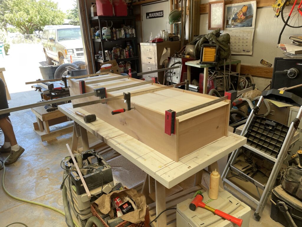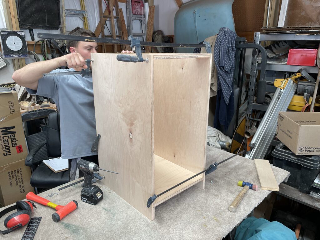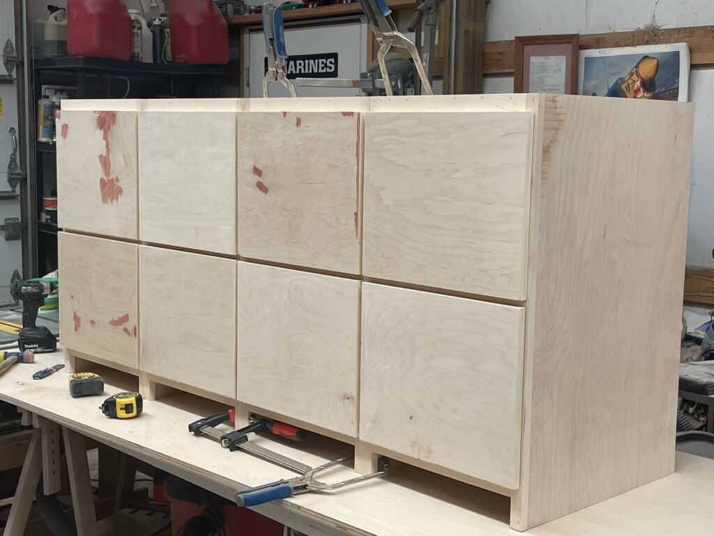 This is a 42” tall base cabinet for a dry bar. It will get adjustable shelving and two frame and panel doors. Verticals dados and horizontal dados on smaller panels can be milled on the table saw with a dado blade. This is the preferable way to run the dados. Horizontal dados on tall panels will need to be milled with a router. Here we are using a 3/4” straight cutter bit. It can be difficult to keep all of your panels flat and square to each other while routing but it’s important to run them together in batches as shown above. Once the milling is done it’s time to assemble. The 1/4” backs and the shelves are glued into the dados on the panels and clamped square while glue dries. Runners get pocket screwed and glued into the panels on the top and back of the cabinet for stability and structural integrity. Make sure you have lots of clamps of all different sizes! The bigger the cabinet the more difficult it can be to keep square. Always check for square while clamping, take diagonal measurements from the front and back and check inside with a square where possible. If the outside panels of the cabinet will be covered by another cabinet it’s fine to throw a screw or nail where needed to bring or hold something together where you want it.