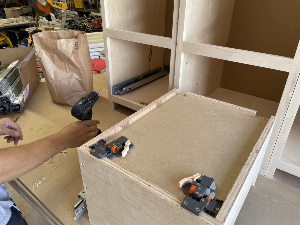 The drawer boxes are made with 5 pieces, 2 sides a front and a back and bottom piece. The bottom piece is set in dados run in the sides, front and back. This construction method creates a inset box on the bottom of the drawer that will be needed for the slides to work. See next picture- We use Blum under mount drawer slides. The slides themselves mount to the side panel of the Inside of the cabinet. Brackets are mounted to the back of the cabinet to support the drawer and clips are installed on the bottom of the drawer box itself to lock into the slides. Drawer boxes are built and installed. Next up are the drawer fronts. Drawer fronts can be made in various styles. Here we used maple plywood and edge banding to create “slab” fronts. Once cut and edge banded the slab fronts are applied to the front of the drawer boxes and adjusted for consistent reveals.